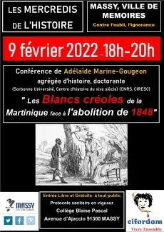 Fil d'Ariane Accueil Actualite Conférence d’Adélaïde-Marine Gougeon, "Les Blancs créoles de la Martinique face à l’abolition de 1848" Évènement Conférence d’Adélaïde-Marine Gougeon, "Les Blancs créoles de la Martinique face à l’abolition de 1848" 9 février 2022