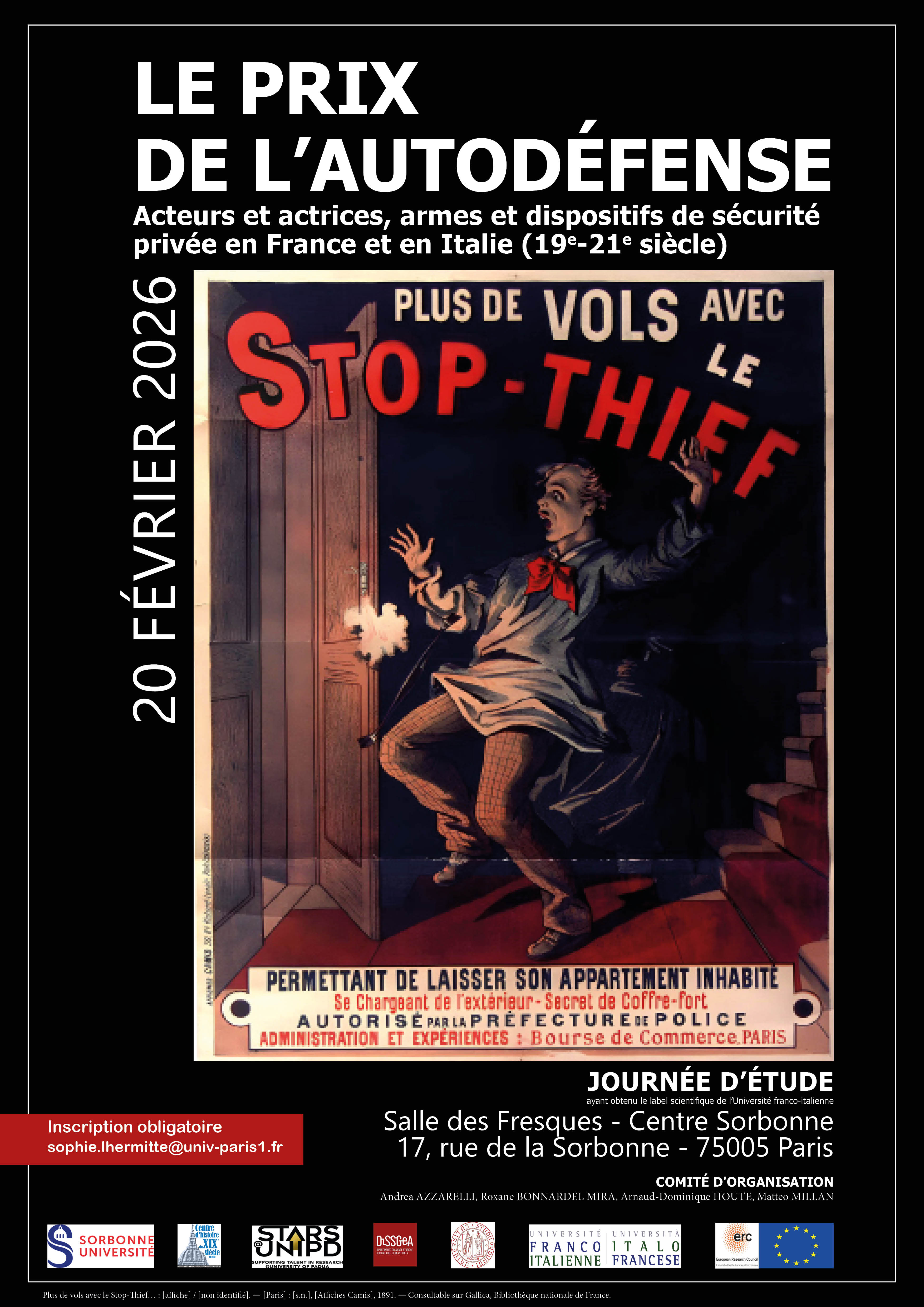Image de couverture Fil d'Ariane Accueil Les événements Le prix de l’autodéfense. Acteurs et actrices, armes et dispositifs de sécurité privée en France et en Italie (19e-21e siècle) Journée d'étude Le prix de l’autodéfense. Acteurs et actrices, armes et dispositifs de sécurité privée en France et en Italie (19e-21e siècle) Programme (Txt 1,3 Mo) >>>Programme (Pdf 1,6 Mo) >>>Inscription obligatoire : sophie.lhermitte@univ-paris1.fr